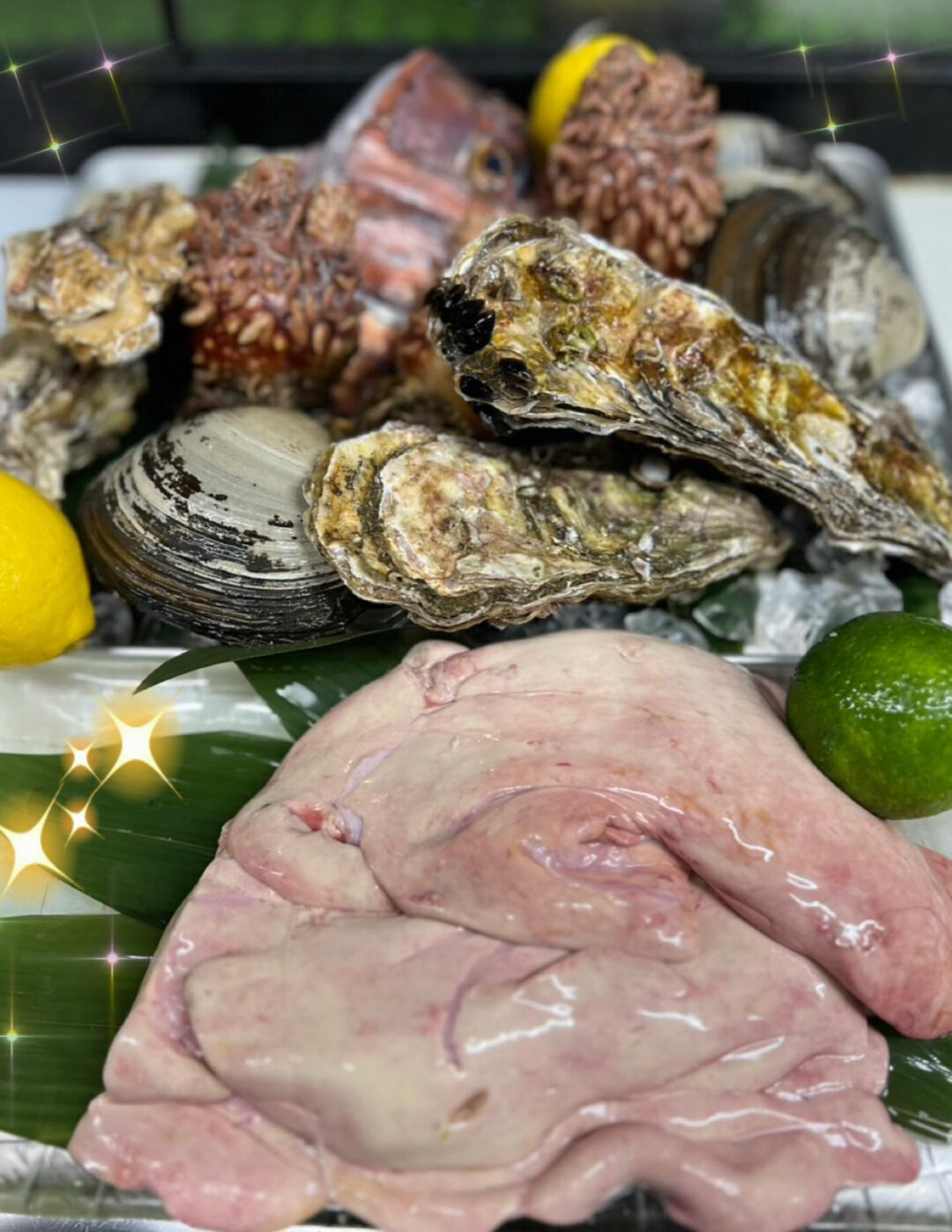 写真は本日入荷の生牡蠣、ホッキ貝、真ホヤ、あん肝です✨